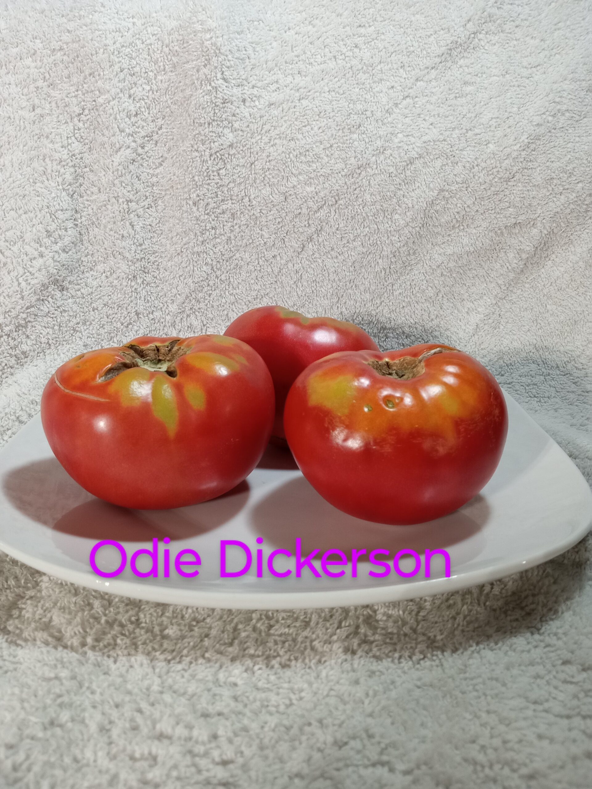 Odie Dickerson is a potato-leafed variety which means that the foliage will look remarkably similar to potato foliage. It is an indeterminate variety with very unique fruits that though red by first glance, as you study it further you see a bit of purplish undertones in it that start to stand out the more you look at it. It is not the most prolific producer in the tomato world, but what you get with this one is a flavor very unlike any other, a very curious tomato in my opinion with an appeal all its own.
